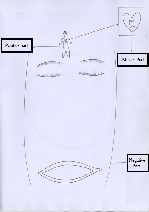 concerning the master part, both mouth and eyes are shut, meaning that this part is neither “thinking” (no mental uttering is expressed), nor “agent” (no practical action is undertaken by this part). As this part originates from the positive agent Ego, its site is in the human heart. Making a contrastive comparison between the shut eyes of the negative Ego and those of the master part, we can notice that in the former the eyes seem to convey terror and fright, whereas in the latter they express calmness and serenity.