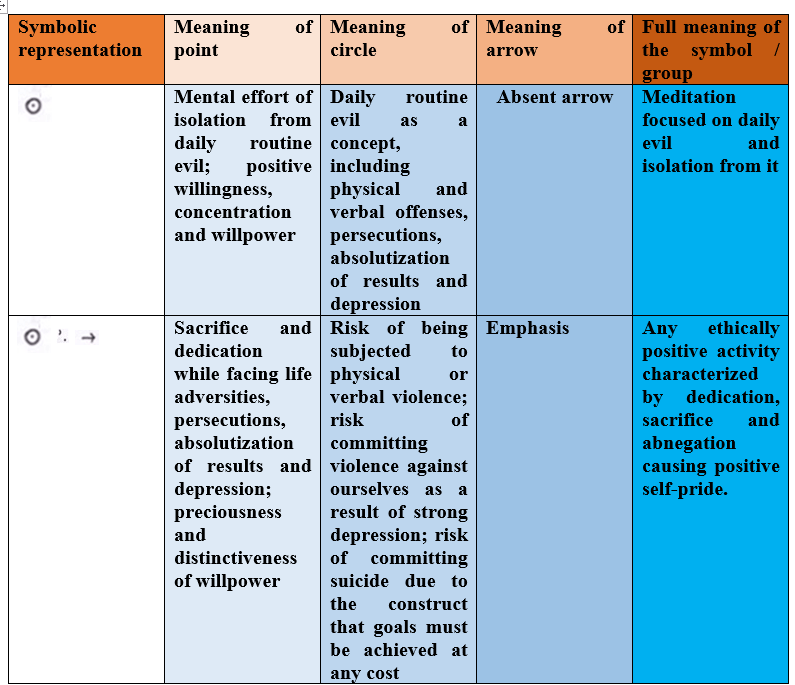 – This acceptation of result never is compatible with violence as the symbol of the fusion between the present and the past mitigated by conventional negativity is still a very positive concept. Also the same fusion never is compatible with depression and anxiety because of its inner symbolic structure (circle + internal point + point in upper position) that also represents the idea of temporal and spiritual preservation.