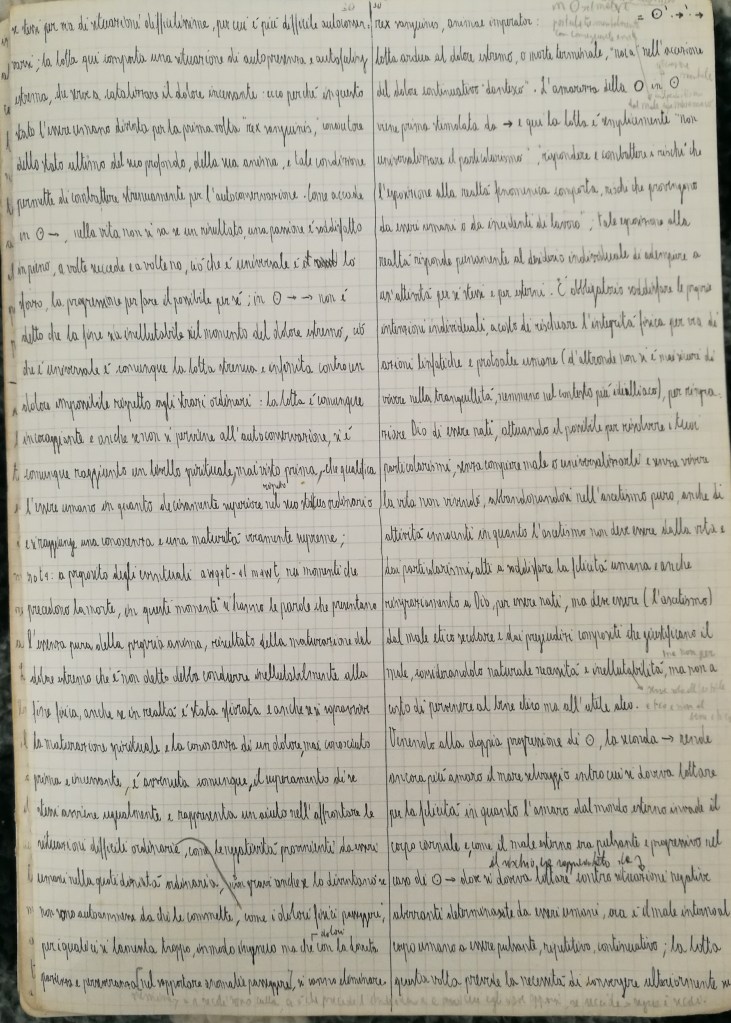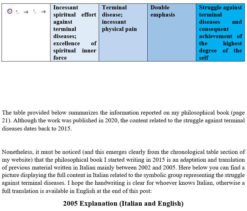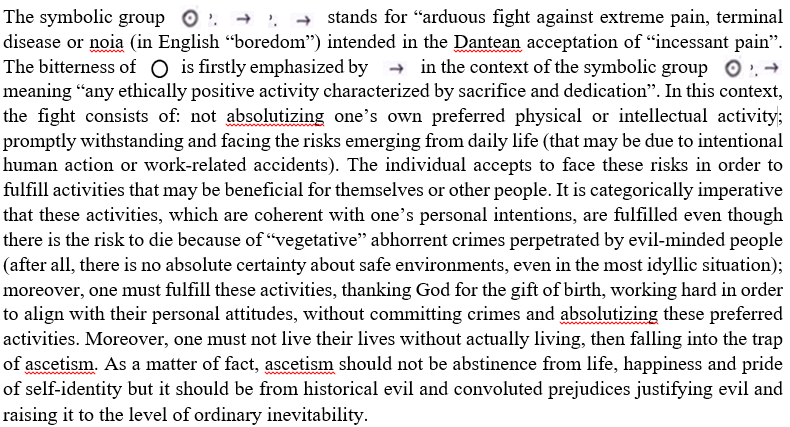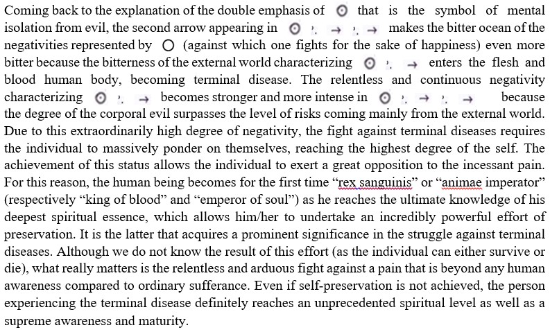 In addition, it must be said that my philosophical symbolic language does not have a phonological system. As a result, it can only be written and never be spoken. Each piece of writing can be commented, but any comment is not intended as a feedback to that piece of writing but as a thought that must be considered separately. The fact that this symbolic language is never used in everyday life communication can be realised in the absence of interrogative forms along with the exclusive presence of the third singular and plural persons paired with impersonal expressions. Incidentally, the personal pronoun “I” is symbolically expressed as “the agent part of the Ego”. In light of this, following the literal symbolic translation, “I” is a third person subject. Due to the emphasis on the categorical reject of violence, the personal pronoun “I” is very often used with the verbal tense “Plenitudo temporis aeterni”, so as to highlight the hypercategorical refusal of violence that goes beyond the earthly world because it challenges the neverending time before and after life :
