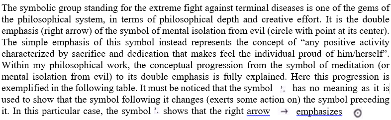 Of course, my constructed language is not designed for human interaction and communication. So its features would be different from those of the mentioned hypothetical language. In spite of this, the fact that the lexicon and symbolic sentences of my language are based upon non violence make this idea as an ever-present pillar of the written symbolic expression. The example of a hypothetical language based mainly on non violence is not what I have done but a suggestion for the future. I have mentioned it to clarify the concept of immanence (or ever-presence) of non violence in my symbolic language. The reason why my constructed language is not designed for human interaction resides in the fact that the function of the symbolic system is to emphasize (through symbols) an idea that is previously expressed in the natural language. In light of this, the symbolic language cannot replace a language but it is something that we add to it and the element that we add is the powerful emphasis. For example, if I say “I persevere in my hobbies” in any natural language, the translation of this sentence into my symbolic language brings the same meaning expressed by the natural language but emphasized in an astonishing way (we could say emphasized as it is any number except 0 when is to the power of infinity (eg. 2∞) .